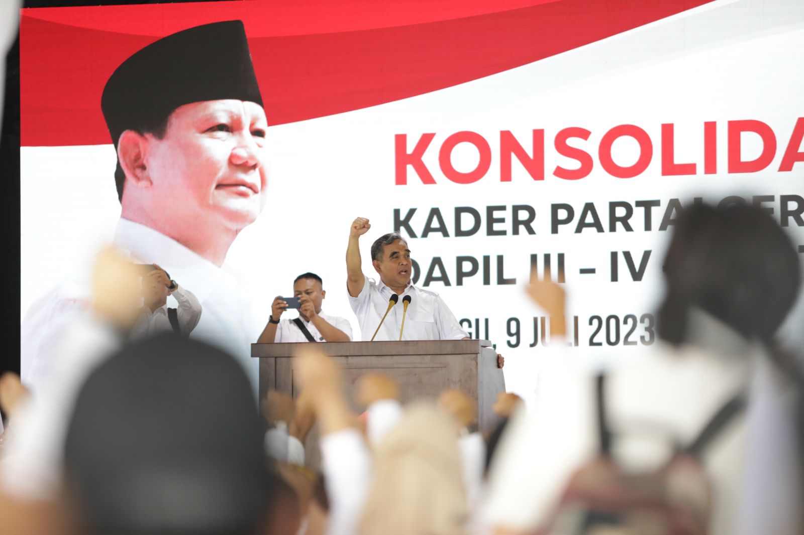 Sekjen Partai Gerindra Ahmad Muzani menghadiri konsolidasi akbar kader Gerindra di Kota Bekasi dan Kota Depok, Minggu (9/7). Ribuan kader Gerindra menyambut dengan penuh semangat untuk memenangkan Ketua Umum Gerindra Prabowo Subianto pada Pilpres 2024.